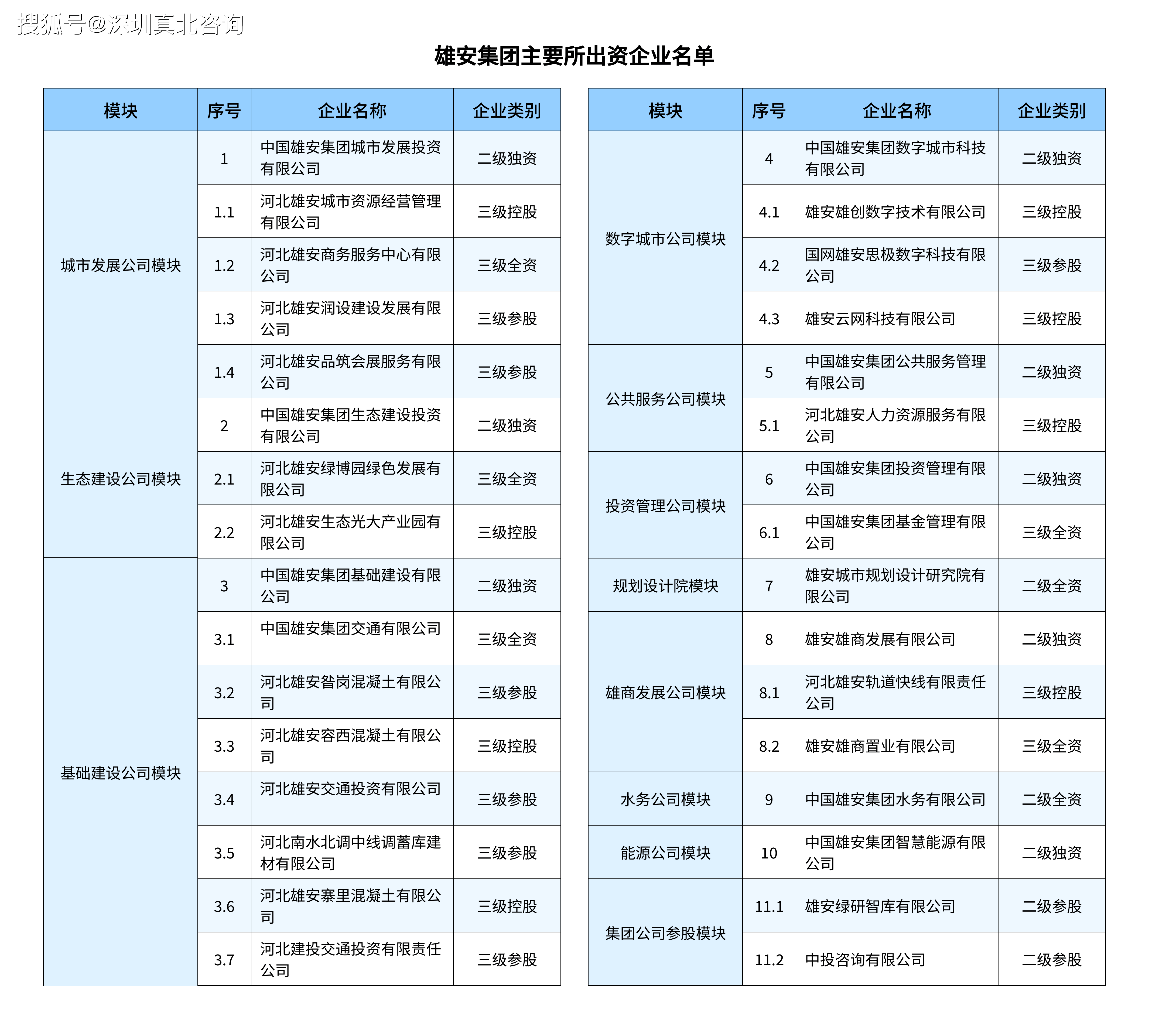 12家二级子公司包括: 城市发展公司、基础建设公司、生态建设公司、数字城市公司、公共服务公司、雄安雄商公司、雄安规划院、水务公司、智慧能源公司、投资管理公司、优采供应链公司、雄安人才发展集团。