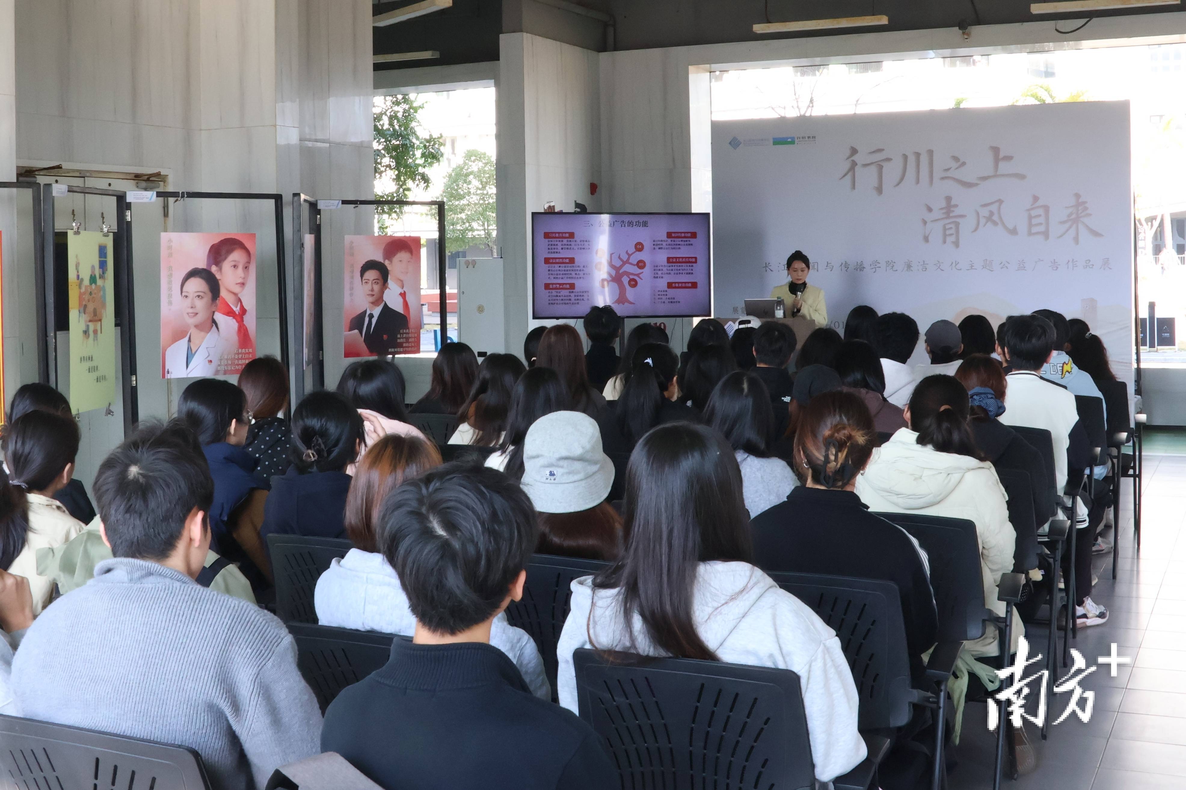 揭幕当天,一场别开生面的公开课同步开讲,让展览成为流动的课堂。“什么是公益广告?”课程教师刘钟惠以设问开启讨论,她强调公益广告的核心在于“公益”二字,不以营利为目的,只为公共利益发声、为社会文明助力。在探讨公益广告多元功能时,刘钟惠特别指出,有效的廉洁教育应避免生硬说教;公益广告的核心价值,在于让公众从被动接收转向主动参与,推动动员从组织行为转化为全社会的自觉行动。