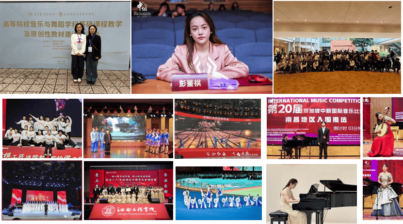 音乐与舞蹈专业坚持“台上十分钟,台下十年功”与“以演促学、以创提质”并重。2025年,音乐表演专业师生在江西省“映山红”比赛中获得佳绩,在中新国际音乐比赛中获一等奖3项,教师彭鉴祺受邀担任赛事评委,彰显专业影响力。舞蹈艺术团全年参演第十二届全国少数民族传统体育运动会开幕式、新余七夕文化艺术节、省麻纺博览会、校迎新晚会等重大活动十余场,成为传播地方文化、展现学院风貌的流动名片。