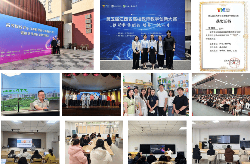 学院全面推进基于学习产出的教育模式(OBE)改革。2025年,《展示设计》教学团队荣获江西省高校教师教学创新大赛二等奖,成为教学改革的典型代表。学院鼓励教师将竞赛指导、项目实践、科研成果反哺教学,在教学过程中突出学生中心,应用导向与持续改进的教学理念,全年出版教材、发表核心论文、获授权专利数量稳步提升,形成“教学-科研-实践”良性循环的教师发展共同体。