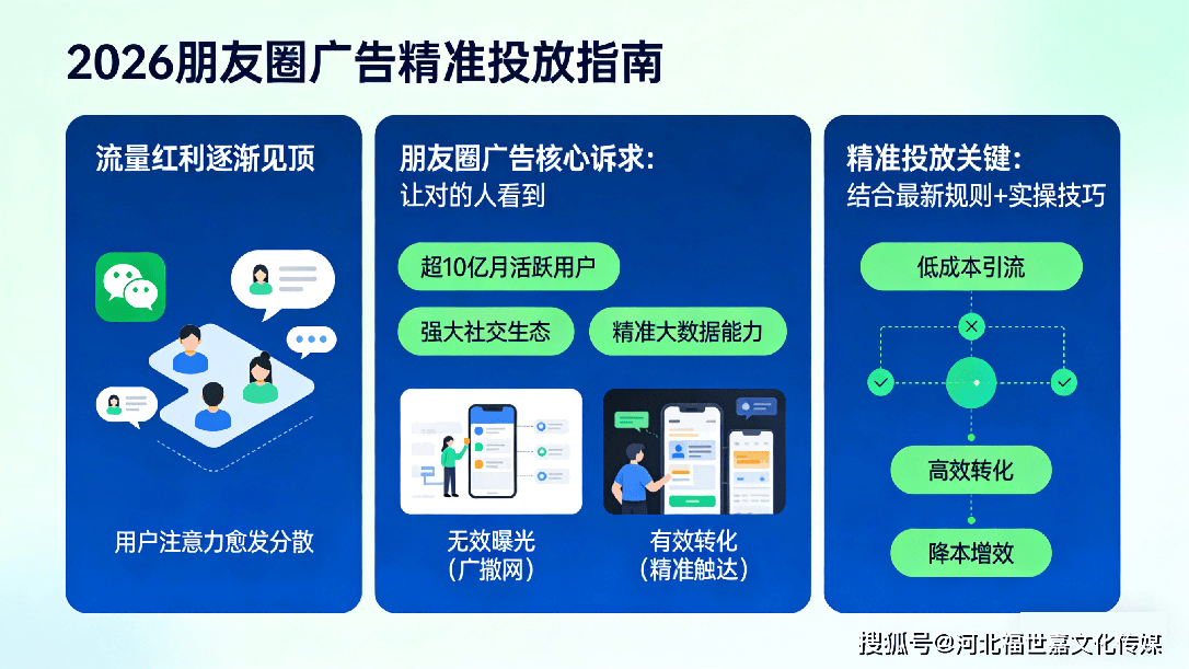 微信朋友圈凭借超10亿月活跃用户、强大的社交生态和精准的大数据能力,仍是2026年企业获客的必争之地。但为什么同样是投朋友圈广告,有人能低成本引流、高效转化,有人却只能看着预算打水漂?关键就在于“精准”二字。今天,我们就结合2026年朋友圈广告的最新规则和实操技巧,手把手教你如何让广告精准触达潜在客户,实现降本增效。