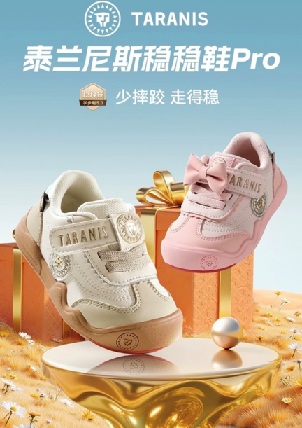 泰兰尼斯精准抓住这一细分需求,打出学步期儿童“专业稳护”的核心王牌,其大单品“稳稳鞋”专门针对10个月-6岁婴幼儿设计,核心卖点便是“走得稳,摔跤少”。