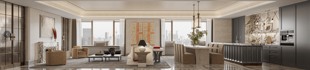 独立的中西厨,独立岛台,客餐厅一体化,这种设计一般250平以上户型都有。