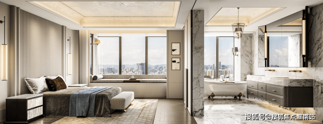主卧套房大面宽,还有个超大卫生间。卫生间是个环游的动线,效果图上看,主卧带双台盆、浴缸、淋浴,甚至还有化妆柜。
